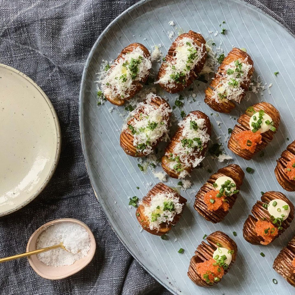 Börja med att göra hack i potatisarna, tips är att ha något på skärbrädan som tar emot så man inte går igenom potatisen med kniven.