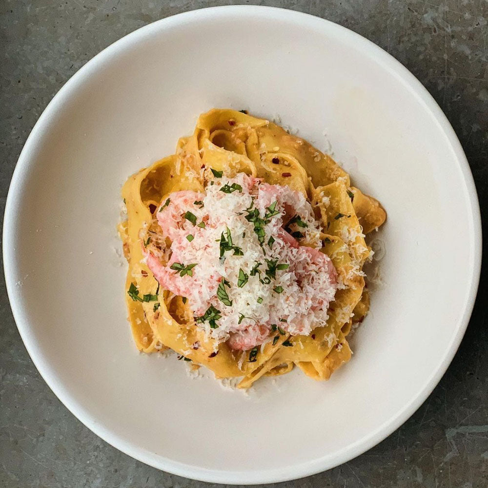 4. I med pastan och blanda runt, toppa med räkor (spara skalen och gör fond av), parmesan och persilja.