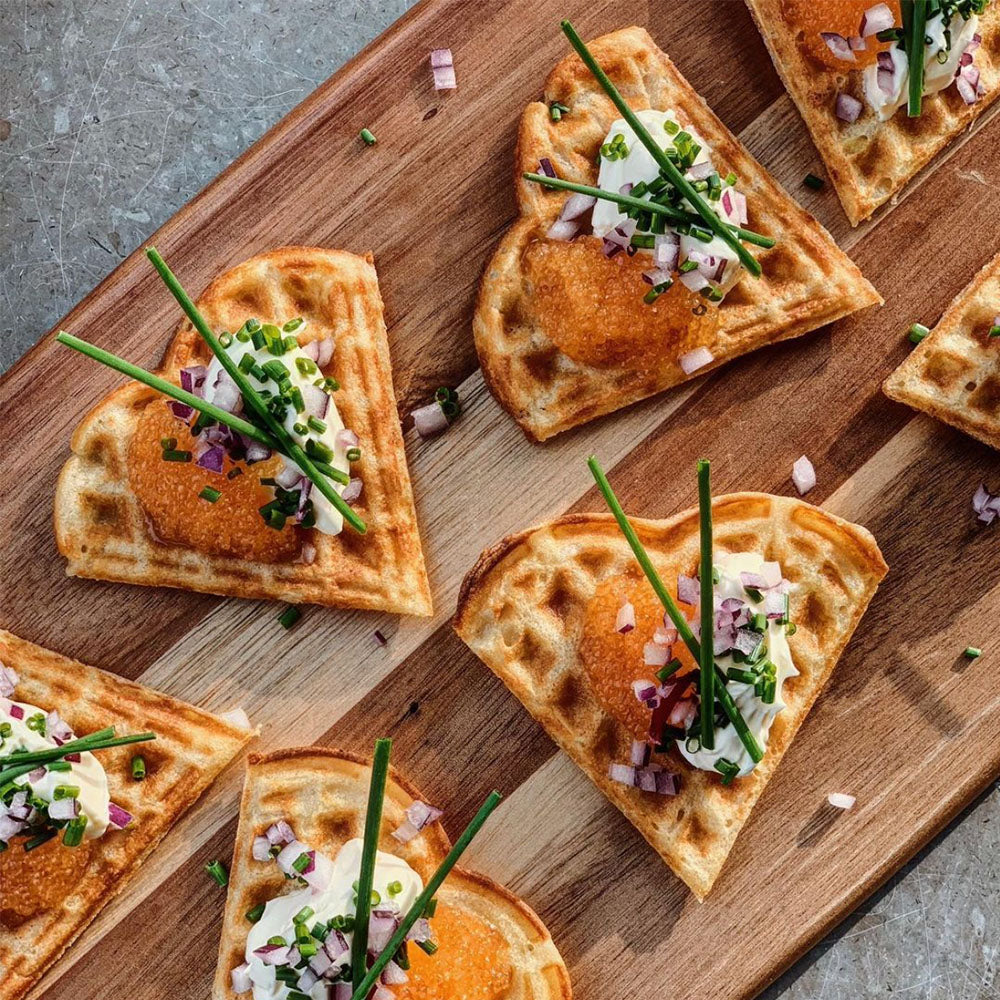 POTATISVÅFFLA MED SMETANA, LÖJROM, RÖDLÖK OCH GRÄSLÖK